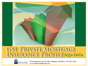 Inside Mortgage Finance’s GSE Private Mortgage Insurance Profile: 3Q16 digs into the third quarter sales of PMI-covered loans to explore the particulars of such business lender by lender for 1,650 companies: what volume of PMI-covered loans each lender sold, what the loan-to-value ratios were, how much of the lender’s GSE sales had PMI coverage, what channel the loans originated in, and which GSE the loans were sold to.